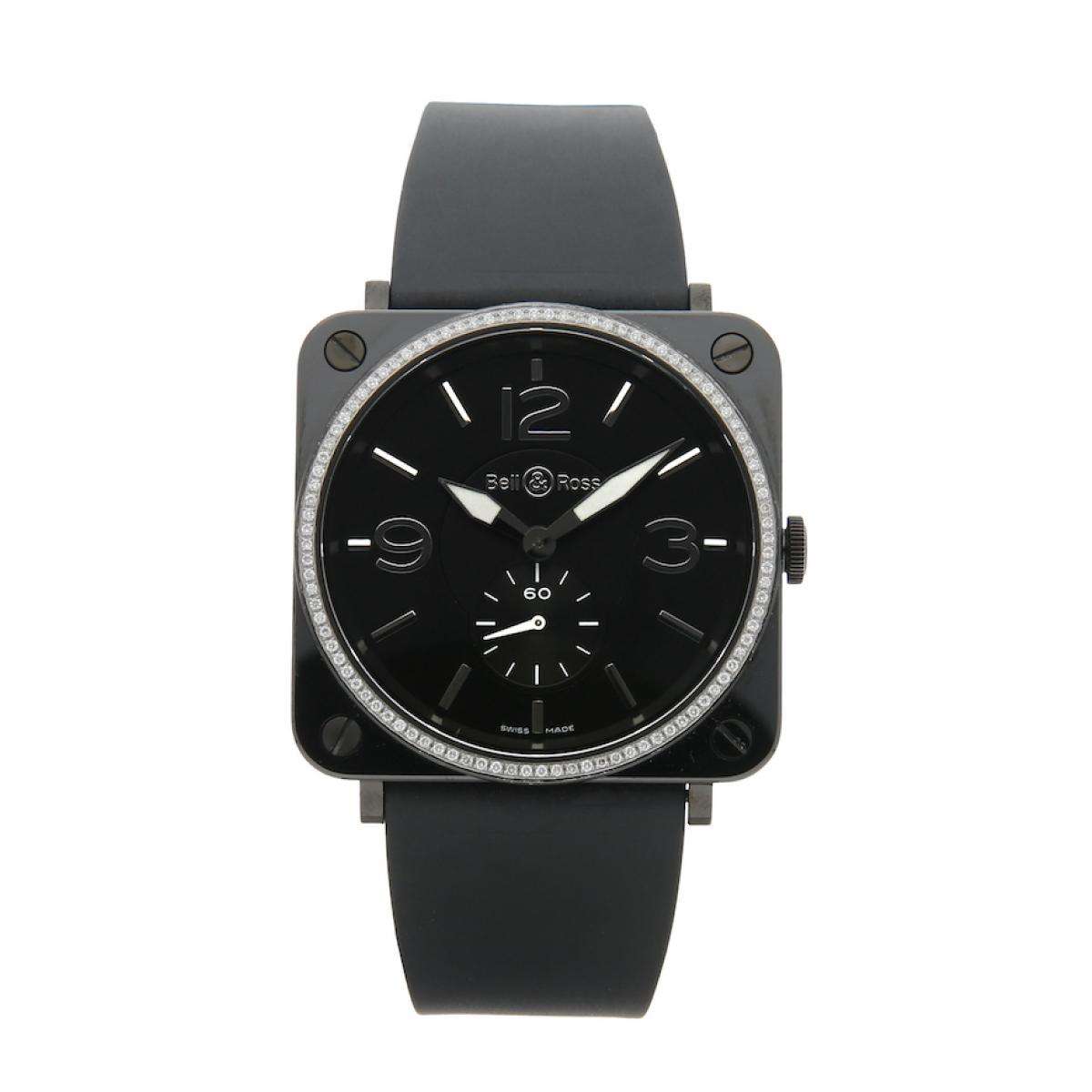 The Bell and Ross ref BRS-98-BCS has polished black ceramic case which is 36mm in diameter. Consist of a black dial, applied hour markers, polished hands, hour & minute hands with luminous fill and a small seconds sub-dial. Fitted on a polished black ceramic rubber strap. This watch provides great legibility in low light conditions.