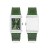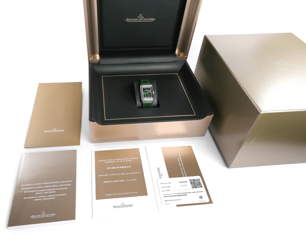 A Jaeger LeCoultre Reverso Tribute Small Seconds ref. Q3978430. This watch features a 27.4mm stainless steel case with a stunning sunburst green dial with a seconds sub dial centred at the bottom. Like all Jaeger LeCoultre Reverso models, the case can be flipped to show the reverse stainless steel side, a neat feature that also serves to protect the dial when flipped. It is fitted with a green leather strap with a tang buckle.