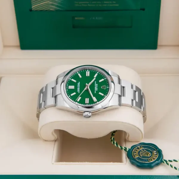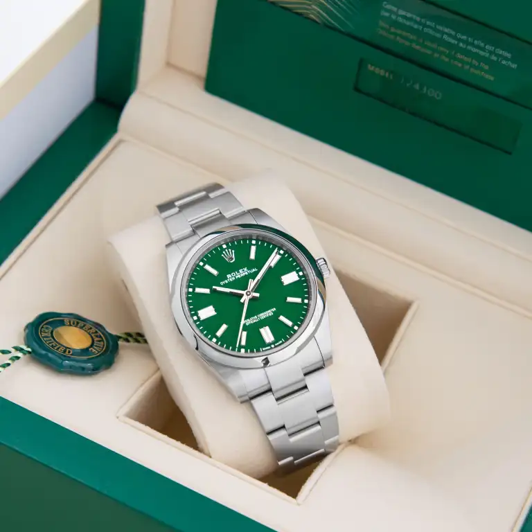 The Rolex 124300 Oyster Perpetual 41 in Green is perfect for just about anybody’s daily lifestyle. This timepiece features a vibrant green double baton index dial. The 41 mm case features a smooth steel bezel on a steel oyster bracelet. This can be worn daily and can be a nice option for someone that wants to stand out from everyone. The green dial works if you are taking the kids to soccer practice or going to a formal event. No matter what direction your life is going, this one will work for it all. The 124300 features a power reserve that lasts up to 70 hours so it’s always ready to go when you’re on the move.